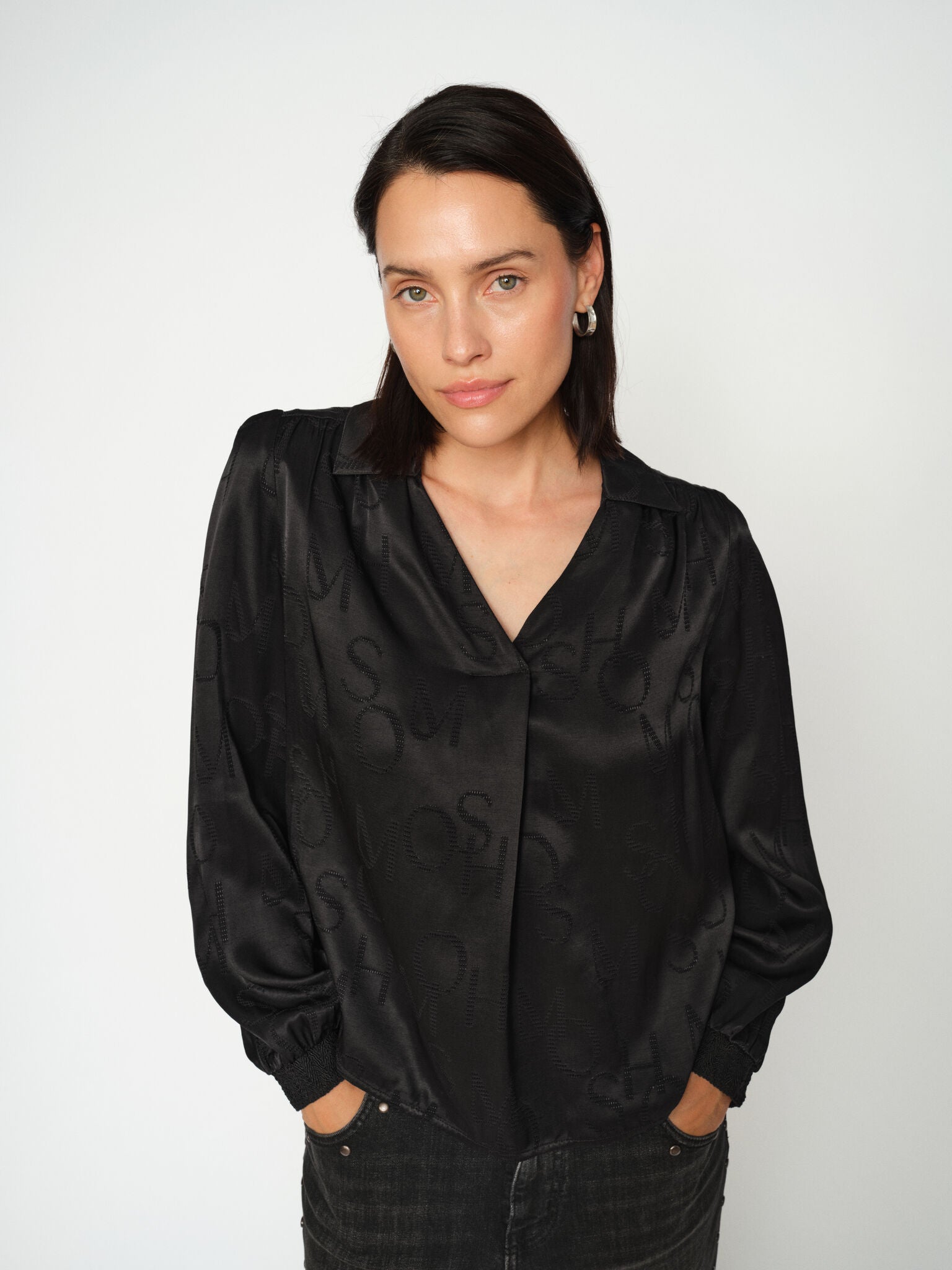 This blouse blends timeless tailoring with a subtle monogram twist. Designed in a slighlty relaxed silhouette, it features a soft drape and all-over tonal MOS MOSH lettering for a subtle yet striking effect. The collar and wrap-style front add sophistication, while the smocked cuffs bring a modern, feminine finish. Perfect for tucking into high-rise trousers or styling loose with denim — this blouse is made to stand out, effortlessly.