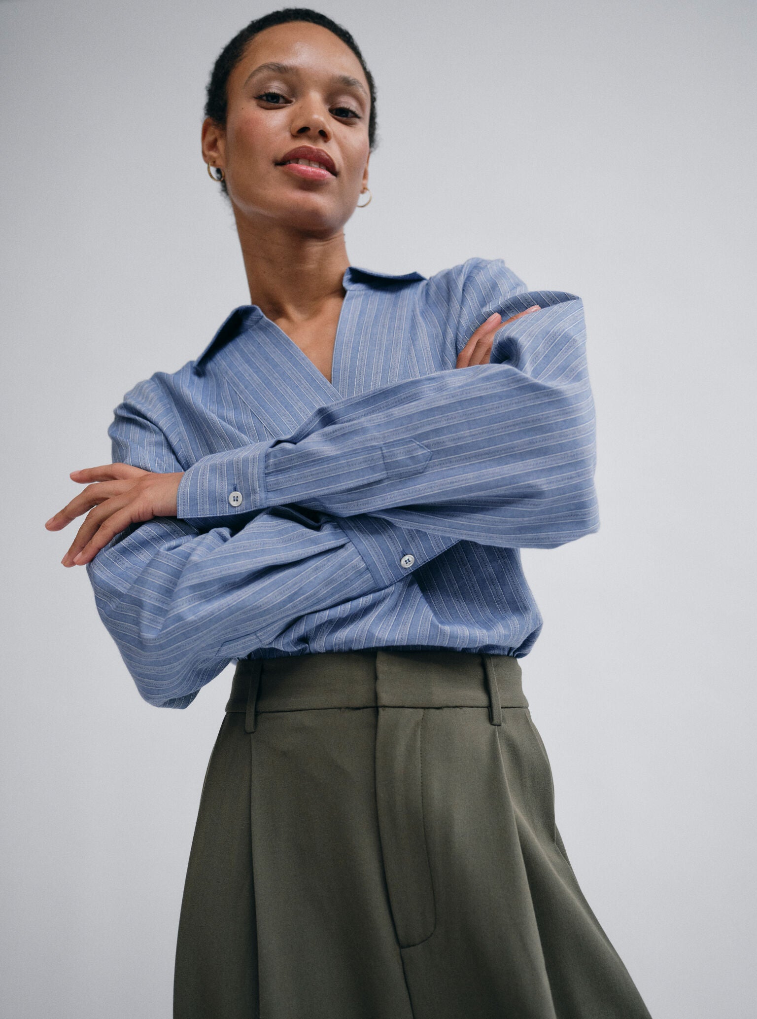 These tailored trousers feature a boxy fit and a versatile high/mid waist, secured with a clean hook closure for a refined finish. Crafted from a structured blend with recycled fibres, they’re designed for both comfort and style. Pair them with a sleek blouse for a polished ensemble or a soft knit for a laid-back yet sophisticated look.