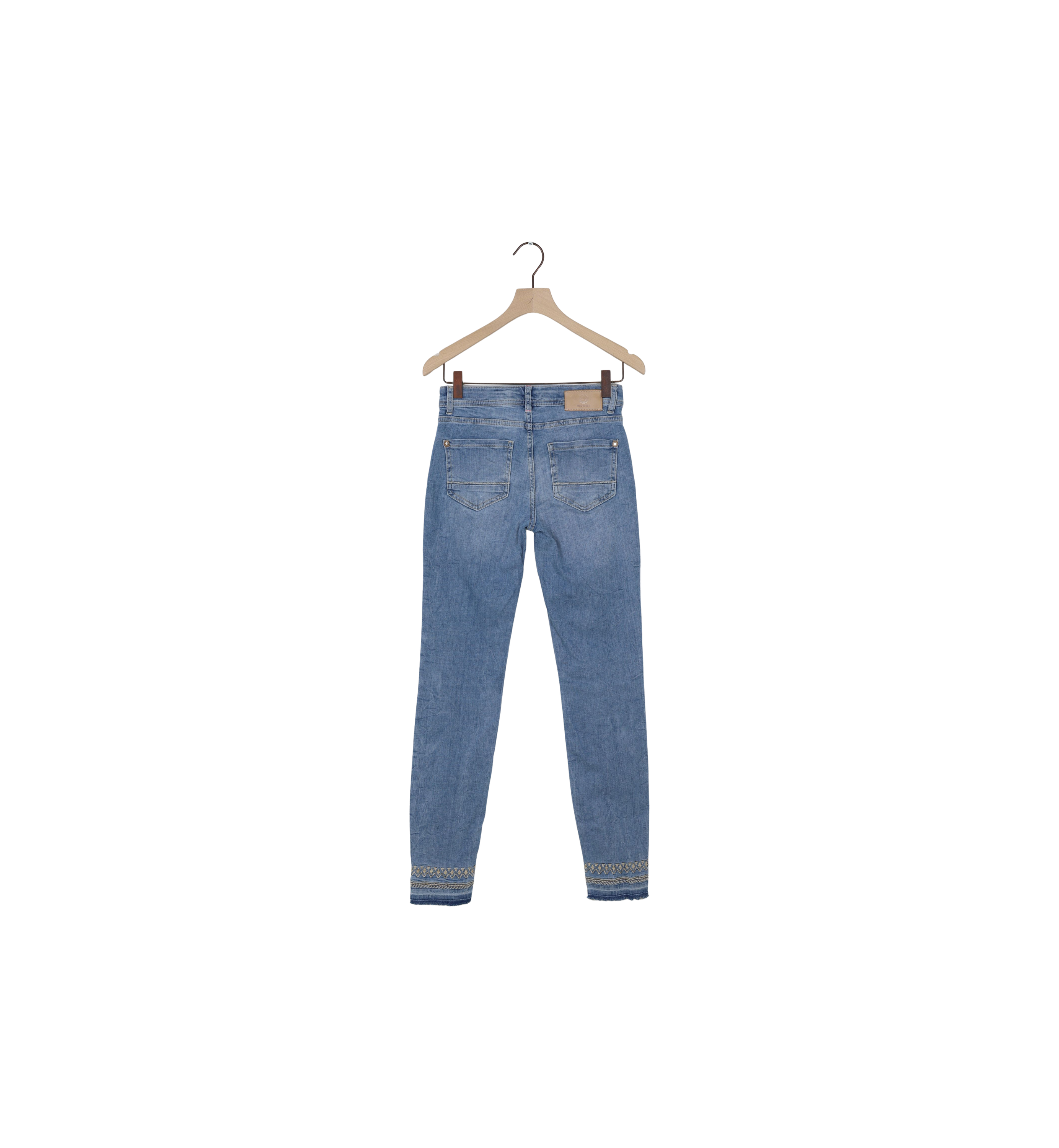These classic denim jeans are made with a twist. Designed with a slim fit, low rise, and ankle length, these jeans are crafted from comfortable cotton with stretch, perfect for all-day wear. The jeans feature subtle destroyed details and a raw hem decorated with stitching and lurex, making them the perfect match for both a casual blazer and tee or an elegant silk top and heels for evening outings.This MMSumner Diva Jeans is a secondhand MOS MOSH style - ready to be ReLoved again.  Price as new is €139, and this secondhand style costs €56.