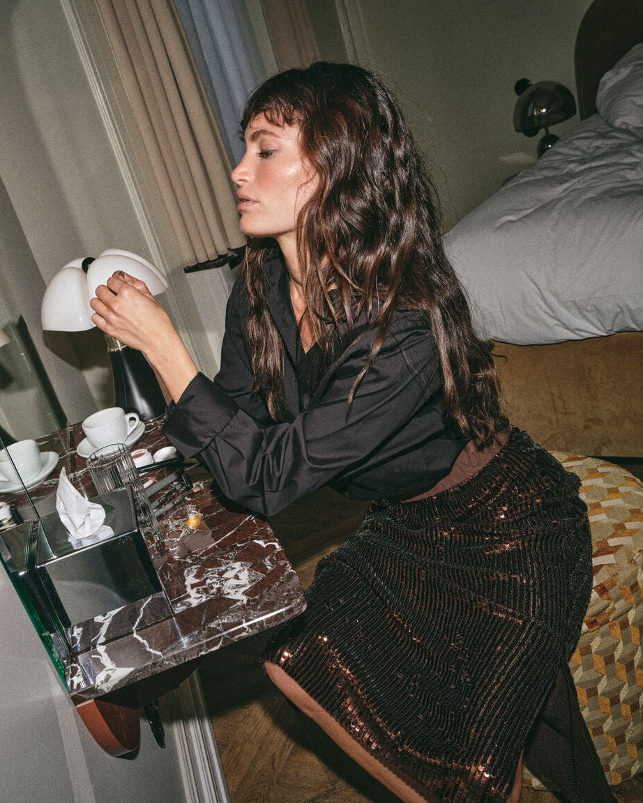 Designed to turn heads, this shimmering skirt is a true statement piece. Cut in a flattering slim silhouette, it’s fully adorned with glossy sequins that move beautifully with the body. The comfortable elastic waistband — embossed with subtle MOS MOSH branding — ensures a perfect fit while adding a sporty-chic contrast to the glam texture. Style it with a soft knit for a cool contrast or go full glam with a sleek blouse. The perfect skirt when you want to sparkle — effortlessly.