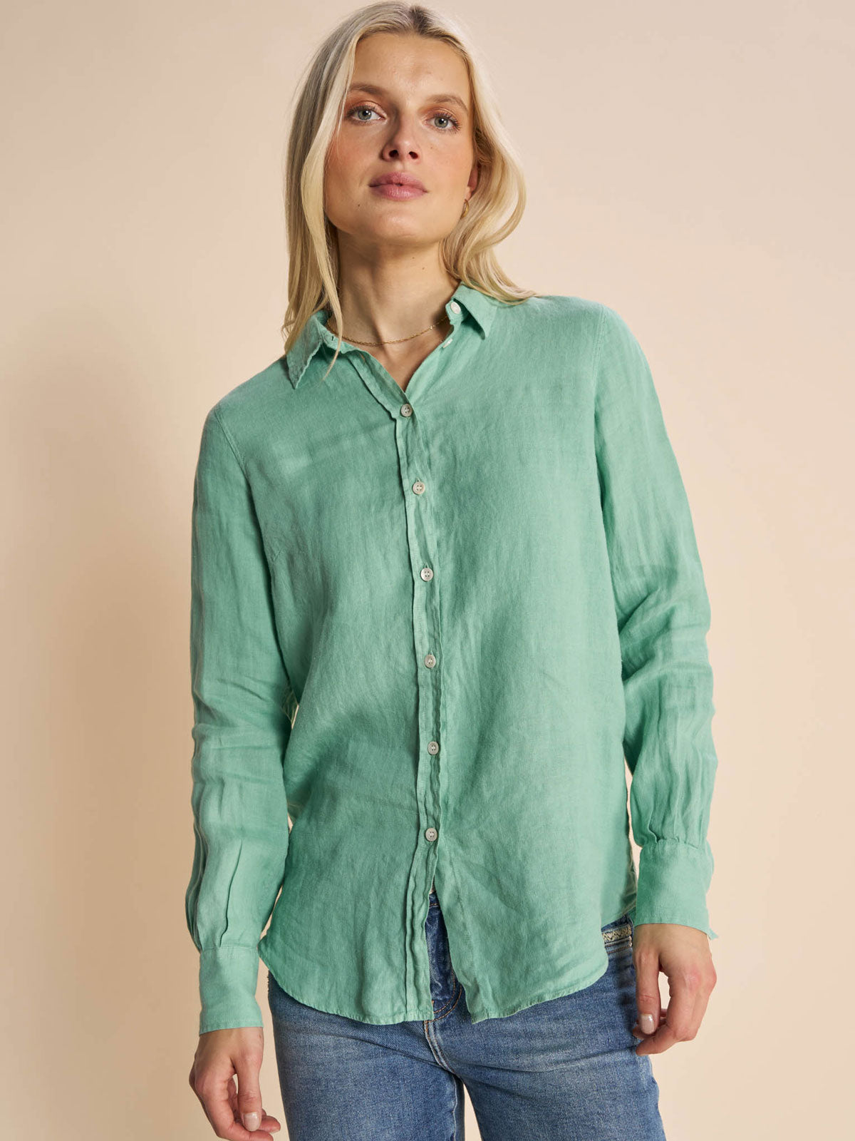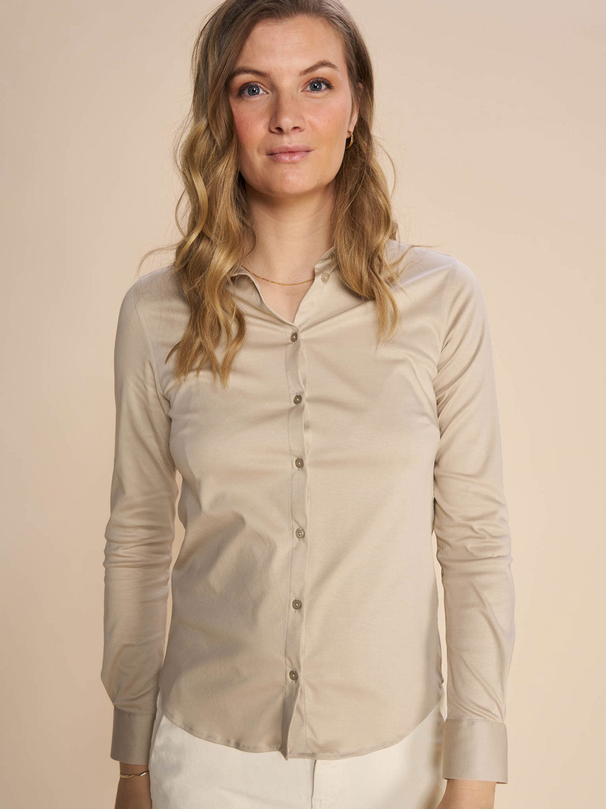 Fitted is a figure-hugging fit that highlights your body shape. This fit hugs your shoulders and chest a bit more than, e.g., our regular fit. Our fitted shirts are, e.g., our classic and iconic shirts as MMTilda, MMMattie, and MMTina Jersey. These three shirts are fitted yet comfortable with stretchy fabric. All of them are true to size. Style it with a swishy skirt, denim jeans or with tailoring.