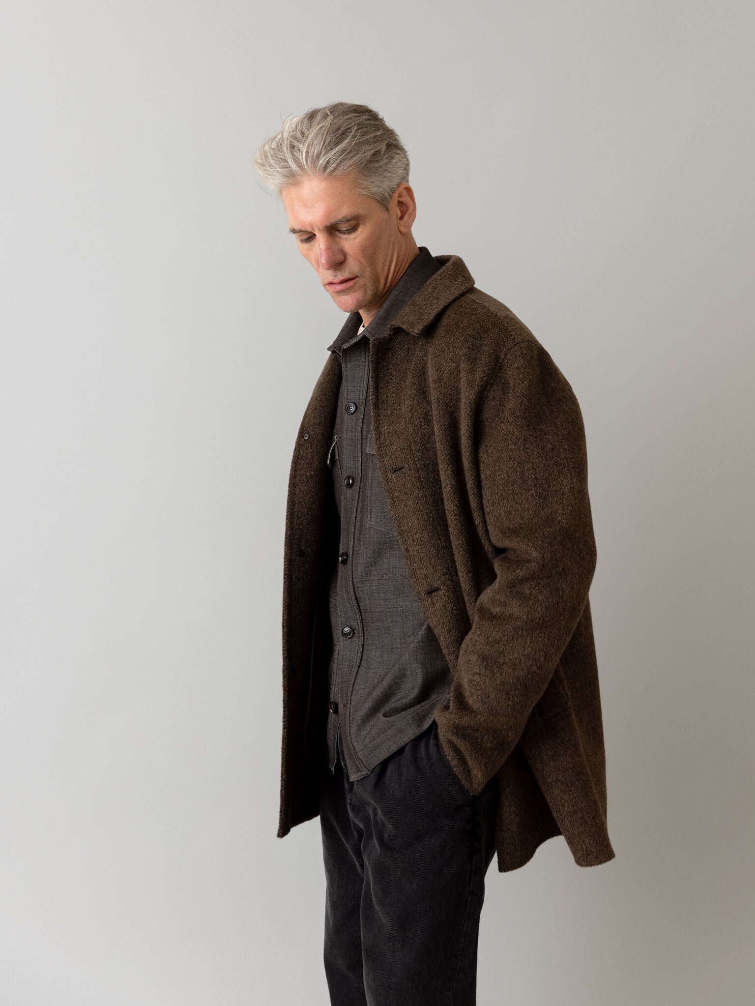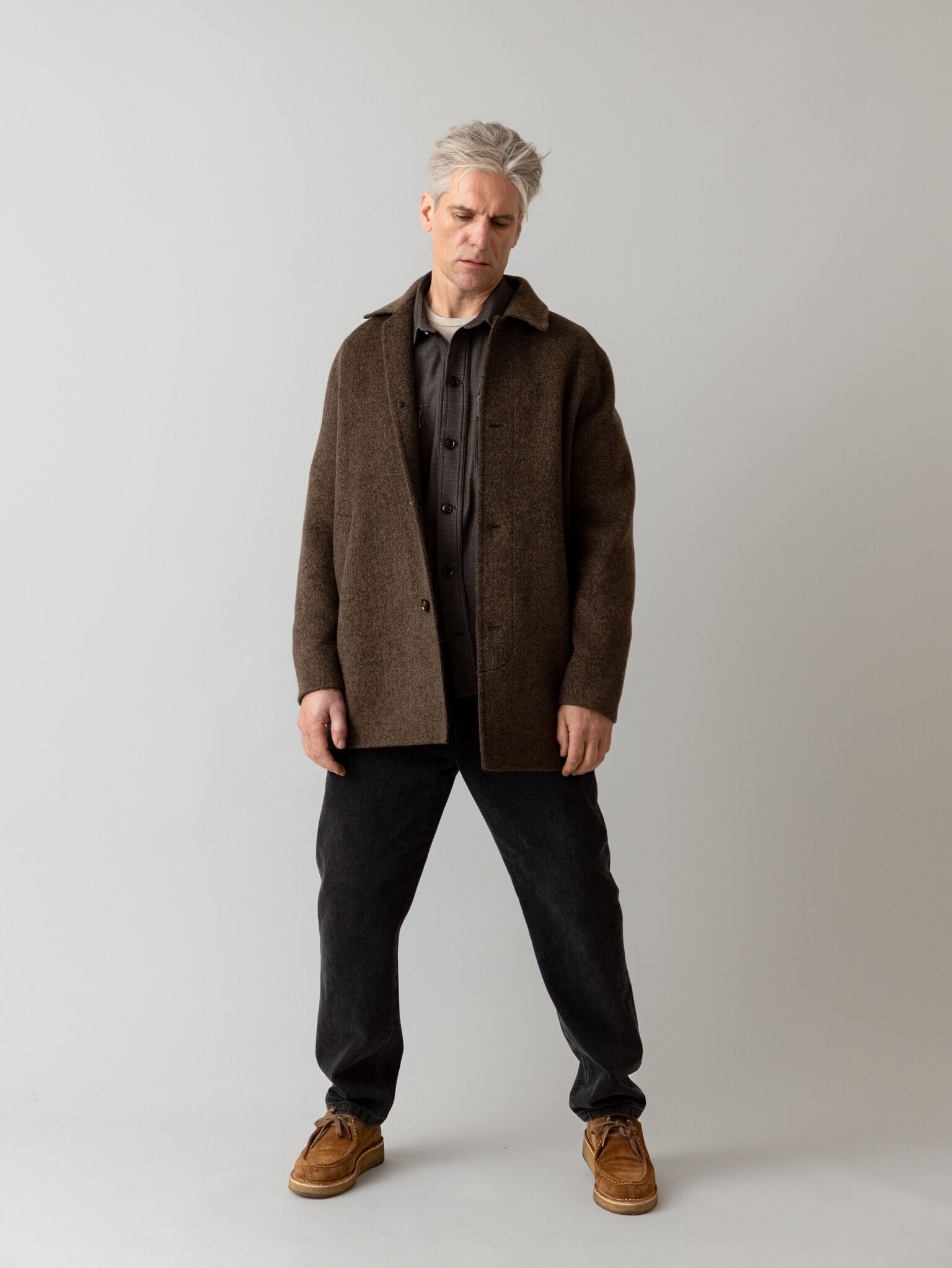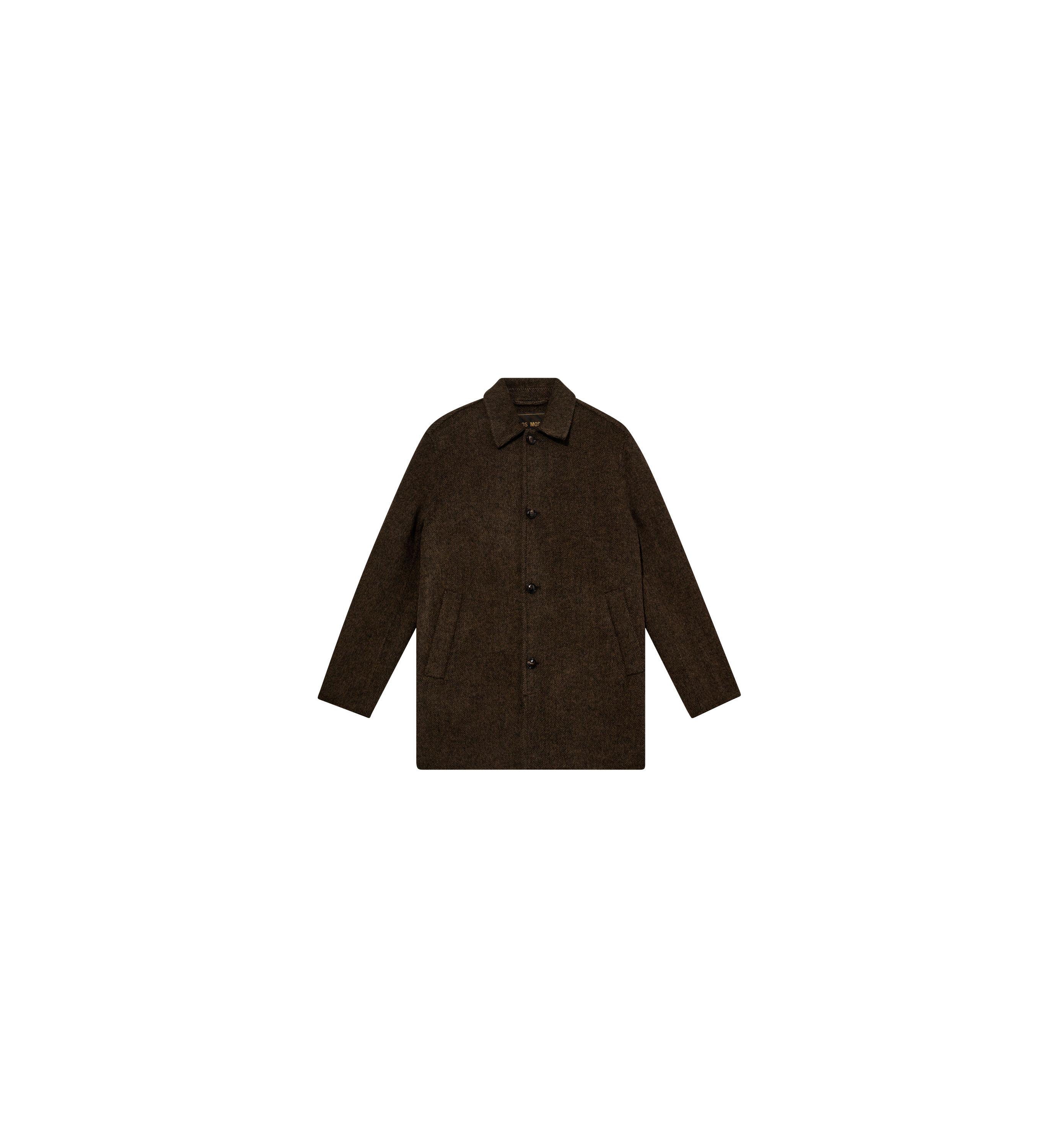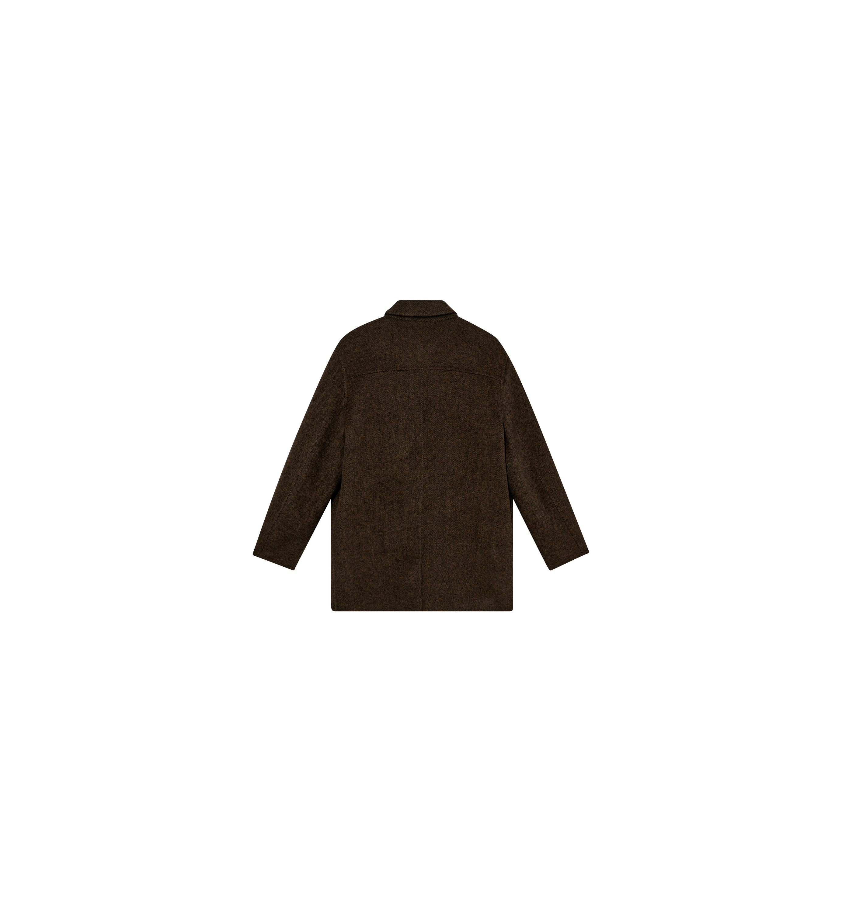 Tailored from herringbone wool, this coat offers a refined silhouette with a light, floating feel. It’s designed in a regular fit with button closure and functional pockets—ideal for layering without the weight. A timeless outer layer that channels understated sophistication with ease.