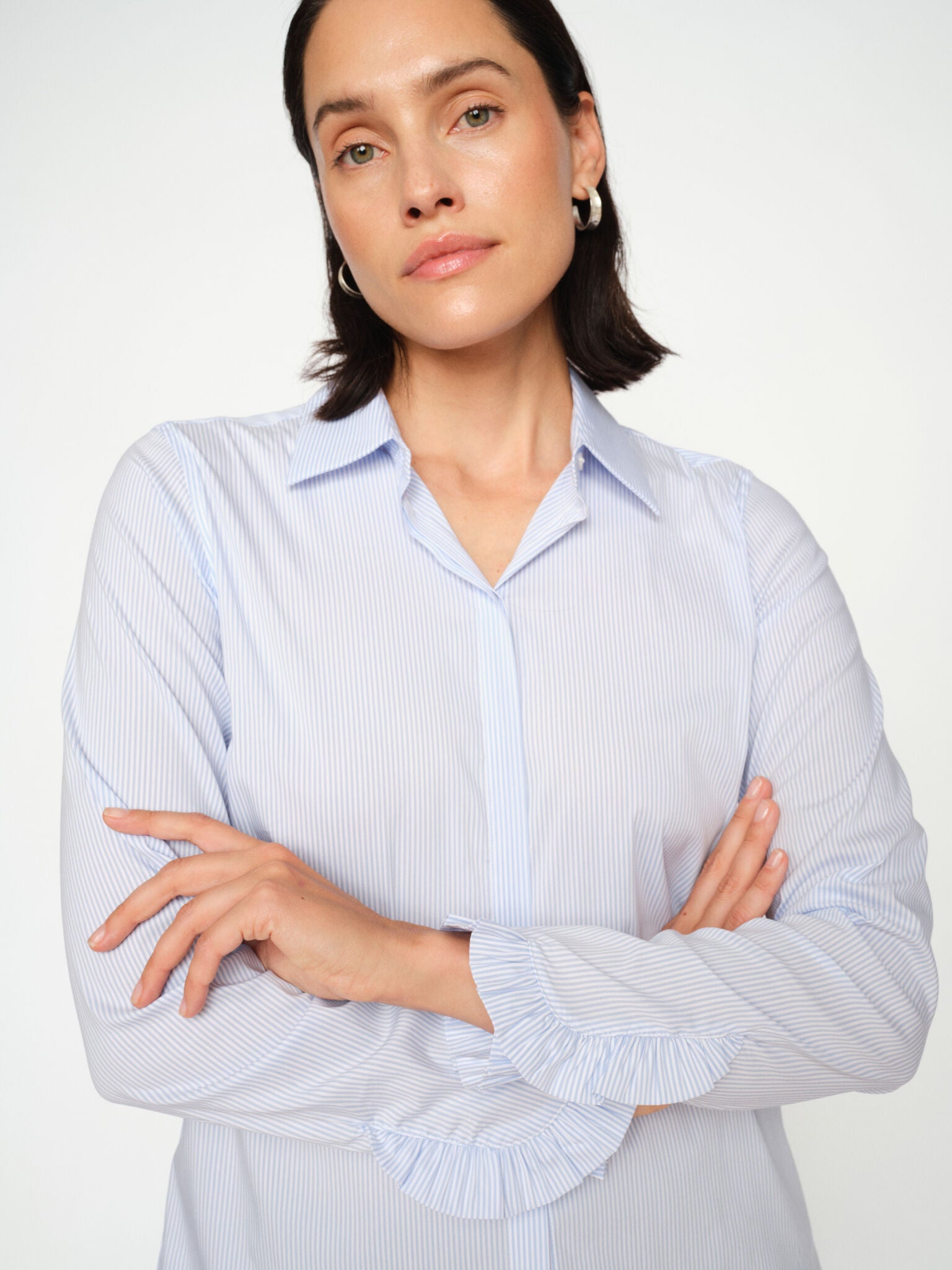 This classic striped shirt is crafted from a soft cotton blend with a hint of stretch for comfort. Featuring a timeless collar and delicate frilled cuffs, it offers a refined yet feminine twist on a versatile design. Pair it with tailored trousers or denim for an effortlessly polished look.